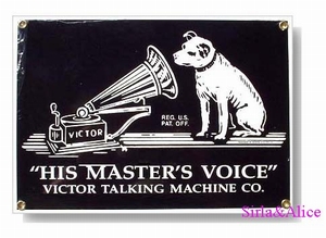 蓄音機で飼い主の声を聞くニッパー君。日本では電気メーカー「ビクター」のトレードマークでした。
