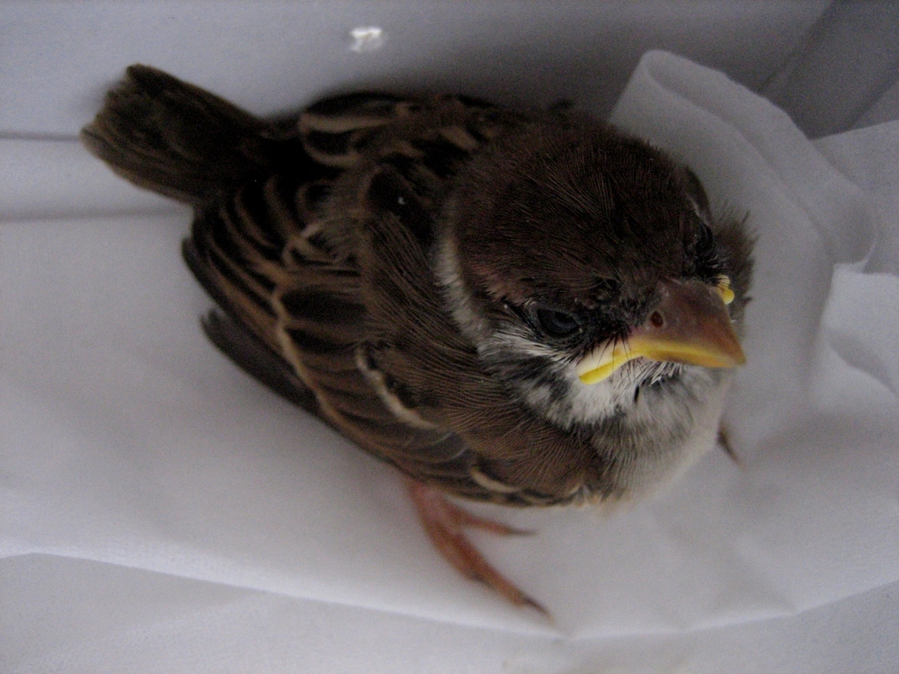スズメのヒナが我が家のカーポートで,うずくまっており,目を閉じており,動かない状態なのだ!。