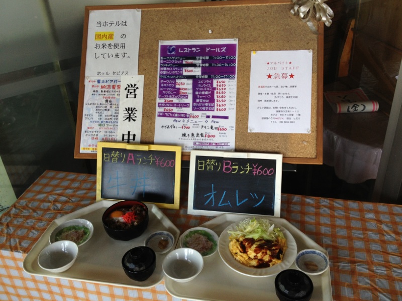 日替わりランチが600円で牛丼とオムレツの二つ。