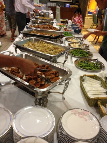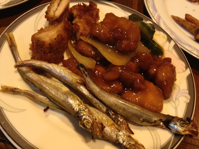 鶏のコンフレーク揚げ、野菜炒め、酢豚、ポテトフライ、焼うどん、柳葉魚、トリゴボウメシ、サラダ、漬物、イカの塩辛、数量限定の手作り?チーズかな? フルーツポンチ、枝豆と有ります。