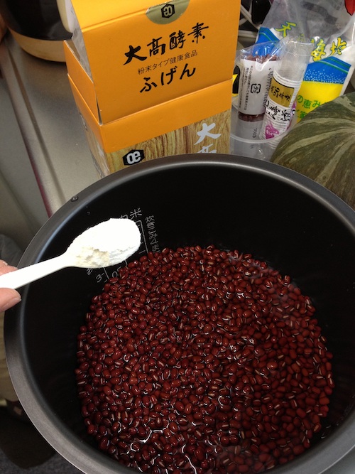 新物の小豆は軽く洗って、ウチは大高酵素のふげん水に漬けて1時間。
