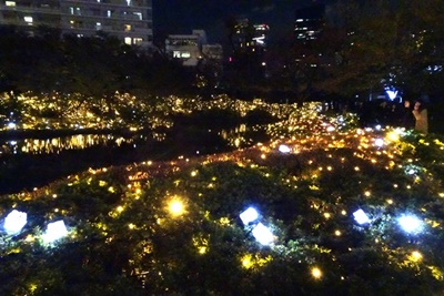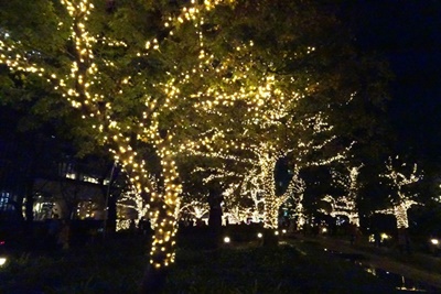 ミッドタウンの裏通りに行くと、ここも例年通りのイルミネーションだった。奥の芝生広場に行ってみる。
