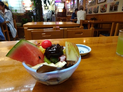 今どきの店とは違い昭和の香りを漂わせていて、高齢者には安心して入れる店だ。私はおやつに「あんみつ」を食べたが、驚くことに銀座の値段の半値以下であった。