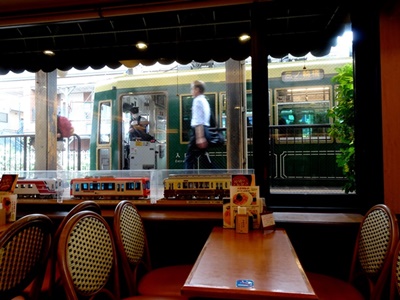 都電が到着すると、店で座っている自分の目線より高い位置に電車が入って来る。