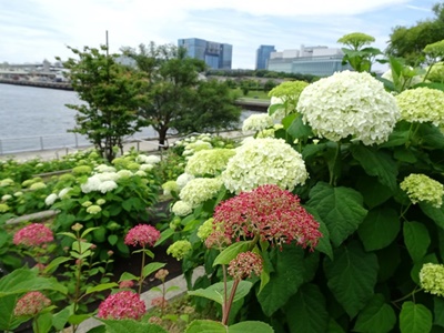 昨年は思い掛けず、「ゆりかもめ」の沿線の青海駅の近くの海岸線で紫陽花の綺麗な場所を見付けた。