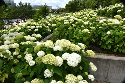 ここは「水の広場公園」と名付けられていて、遊歩道を取り囲むように紫陽花が植えられている。