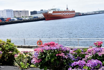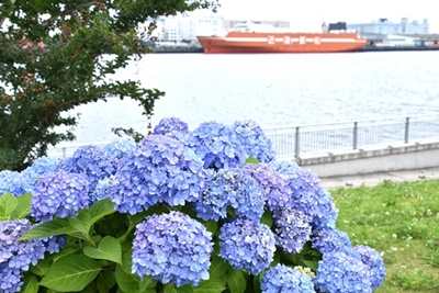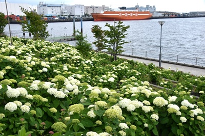 振り返ると紫陽花の遠く向こうに、東京ビッグサイトの奇抜な建物が見える。目の前のコンクリートの歩道の向こうには、貨物船が停泊している。