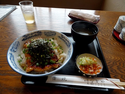 「ひつまぶし」のように刻んだ鰻の上に刻んだネギと海苔がかかっていた。お汁も「肝吸い」ではなく、ワカメ入りの味噌汁だった。