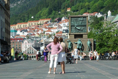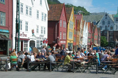 フィヨルド観光を終えて、バスは西の外れのスウェーデン第2の都市であるベルゲンに向かう。人口22万人のこの町はフィヨルドが始まる港町でもある。 港に面した古い町並みは世界遺産に登録されている。古い倉庫を利用したお店が続く町並みは三角屋根が特徴で、これが世界遺産だそうだ。