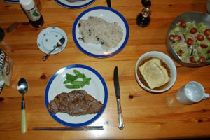 メインはビーフステーキ醤油味、オニオン・グラタンスープ、野菜サラダ、ガーリックライスであった。K君がシェフで、H君は助手である。