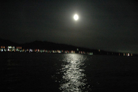 真っ暗闇の中で陸の灯と中秋の名月が明るい。1時間くらいしてガツンという引きがあった。
