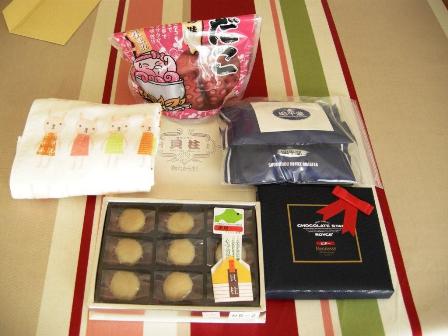 煮タコ、コーヒー、チョコレート、タオル、ホタテ貝である。