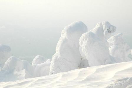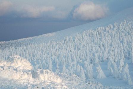 明るい内は真っ白な樹氷に感動し、夕陽の落ちる頃の樹氷は影が美しい。