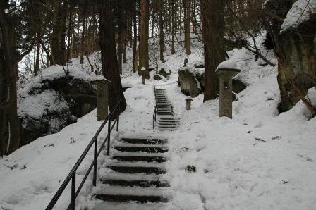 凍った石段を降りるのは往きとは大違いで、命がけである。長靴の女房と娘はどんどん先へ行ってしまう。