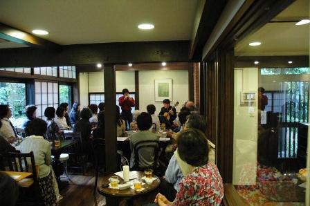 前半は和洋のヒットソングをギターの伴奏で7曲を演奏した。ここで中休みとなり、ケーキと紅茶が出る。