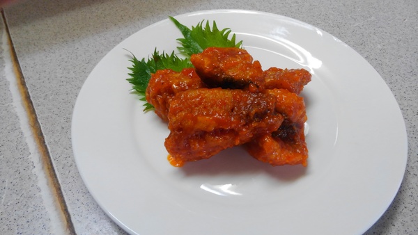 を混ぜて簡易なチリソースにし、熱したごま油・みじん切り生姜とあわせ、揚がった魚と軽く炒め合わせて完成です
