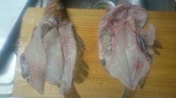 2は、三枚に下した魚の骨のほう、身のほうに軽く塩コショウをした後、骨は弱火で素揚げし、せんべい的に食べれるようにします。
