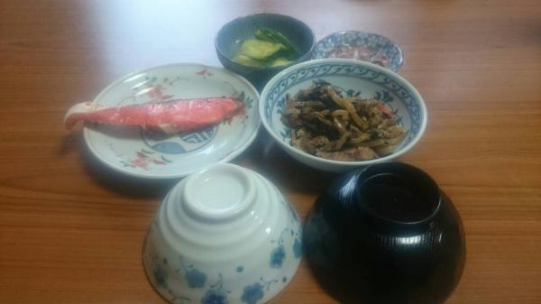 朝らしく鮭がメインの朝ごはんと、