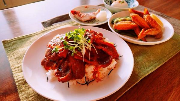 今日のメインは厚切り豚丼です。豚肩ロース肉を、