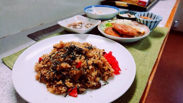 今日のメインは道産豚と道産牛蒡の炊き込みご飯です。