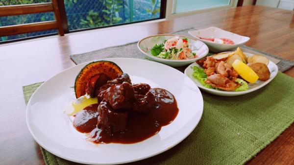 赤ワインでじっくり煮込み、とても柔らかくなっています。