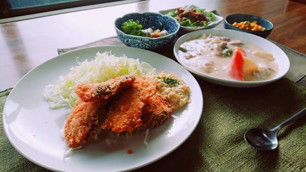 旬の秋鮭フライは、骨をピンセットで抜いているので