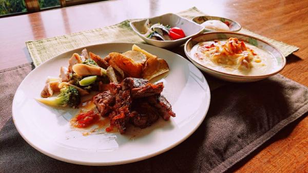 今日のビーフステーキは、付け合せ、ソースなど