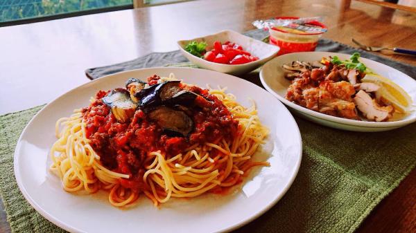 今日のメインはナスのミートソーススパゲティです。