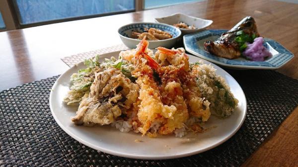 皿盛りの天丼には、他に、舞茸、かぼちゃ、