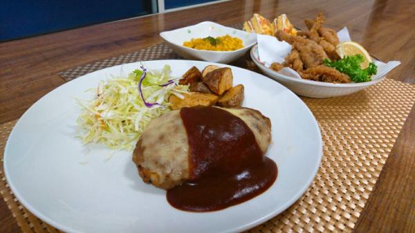 今日のメインはジャンボハンバーグチーズ乗せです。