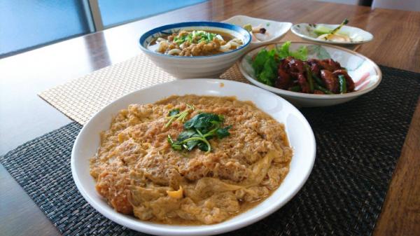 カツを卵ニケでとじて、上に三つ葉です。