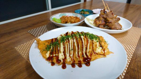 オムそばは、卵地に、お好み焼きの粉の水溶きを