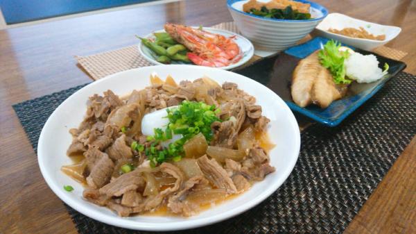 牛肉と、玉ねぎを甘辛く煮て、温泉卵を乗せました。