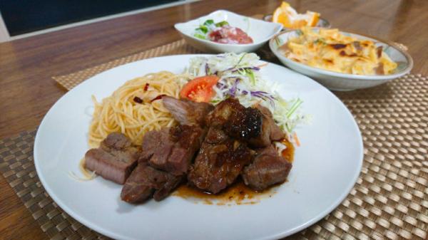 すりおろし玉ねぎを炒めて、甘味をつけた手作りステーキソースをかけました。