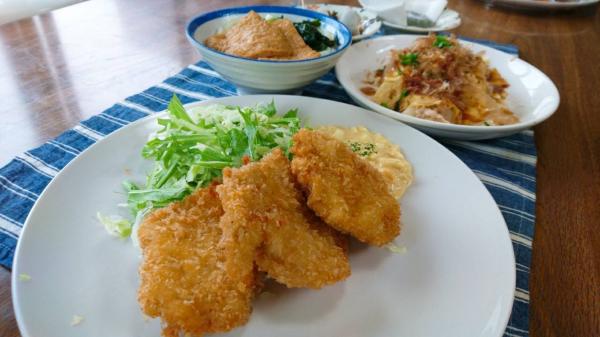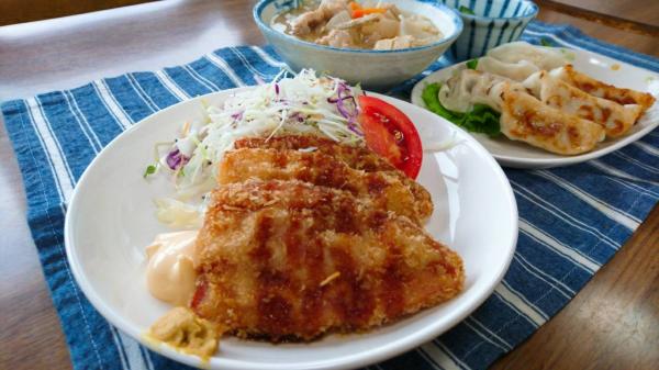 ベーコンカツも久しぶりです。1CM位の厚さに切ったベーコンをフライです。たっぷりの野菜と一緒にどうぞ。ベーコンには、是非からしをつけて食べてください
