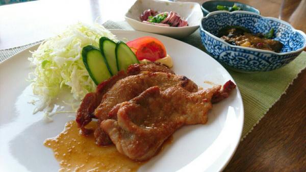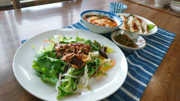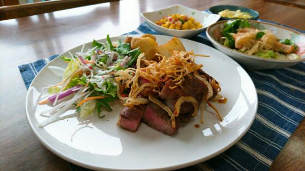 生野菜と盛り合わせて、にんにくチップをのせました。