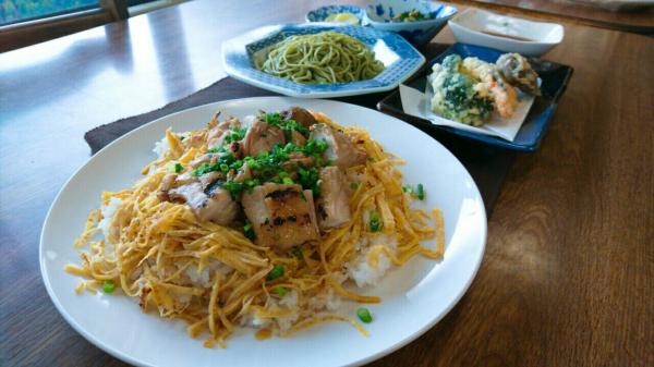 茶そばを使いました。天ぷらと一緒にどうぞ。