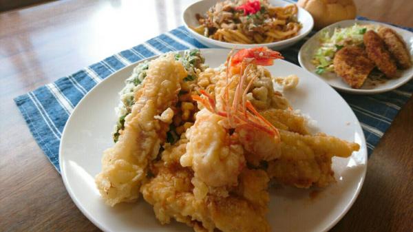 エビ、鶏もも肉、ちくわ、春菊、しめじ、コーンかき揚げを盛り合わせ、自家製天丼タレをかけました。