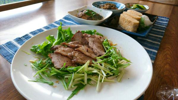 ラーメンサラダは、朝もぎのレタスと水菜をしき