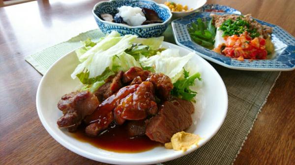 室蘭焼き鳥風のタレで豚肩ロースを照り焼きにしました。にんにく、生姜、ざらめ、正油、隠し味に少し味噌などを