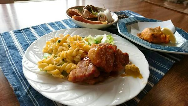 付け合せは卵マカロニサラダです。黒胡椒をきかせて