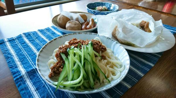 彩りよくきゅうりの千切りを乗せ肉味噌を混ぜて
