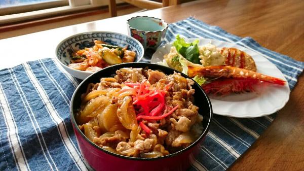 ご飯、たれ、切りのり、肉、生姜と重ねています。