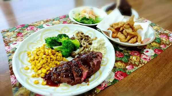 北海道産牛モモステーキに、にんにく醤油のステーキソースと山ワサビを添えています。