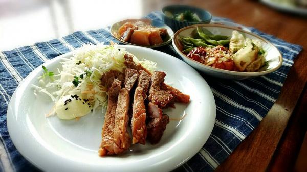 豚ロースを筋きりして、生姜醤油につけ、ゆっくり焼きました。