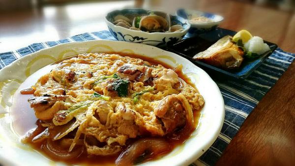 濃いめの煮汁で、玉ねぎと共に煮て、卵でとじてあります。