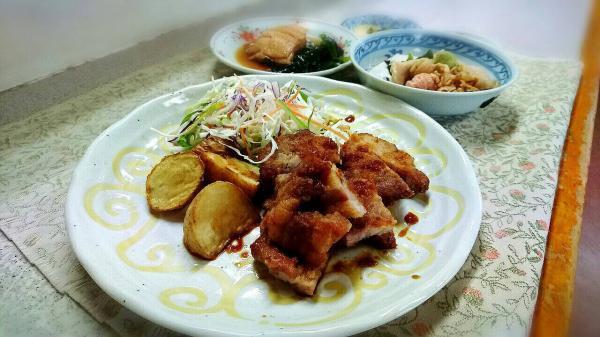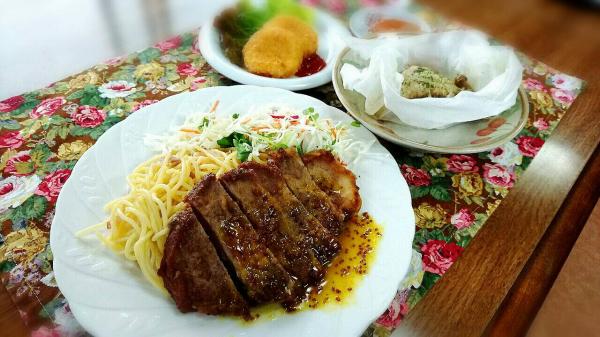 豚肩ロースの厚切りを小麦粉を薄く付けカリッと焼きます。