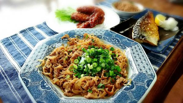 牛肉と白滝をじっくり煮て、煮汁を切り、