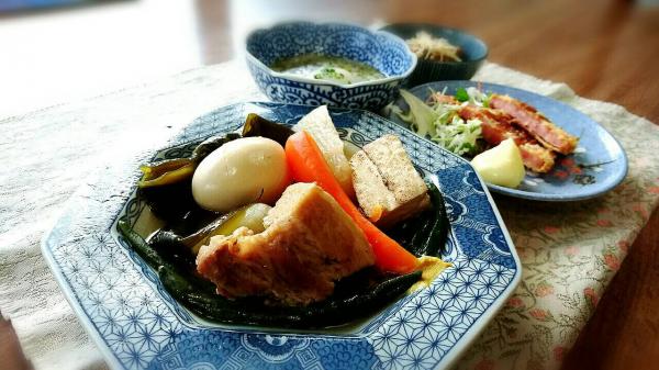ダシを利かせた煮汁で、豚バラ角切り、大根、人参、卵、