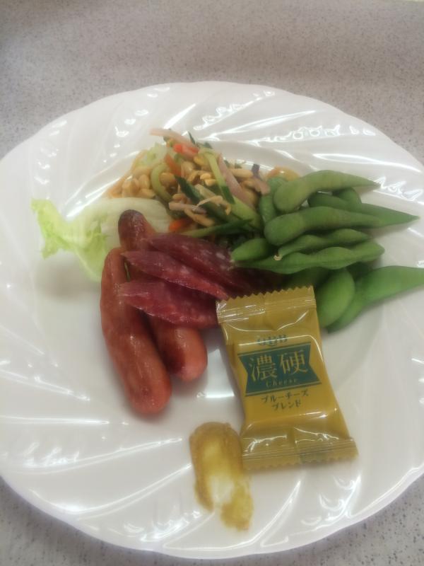 お酒のおつまみに枝豆・チーズ・サラミ・ビビンバ